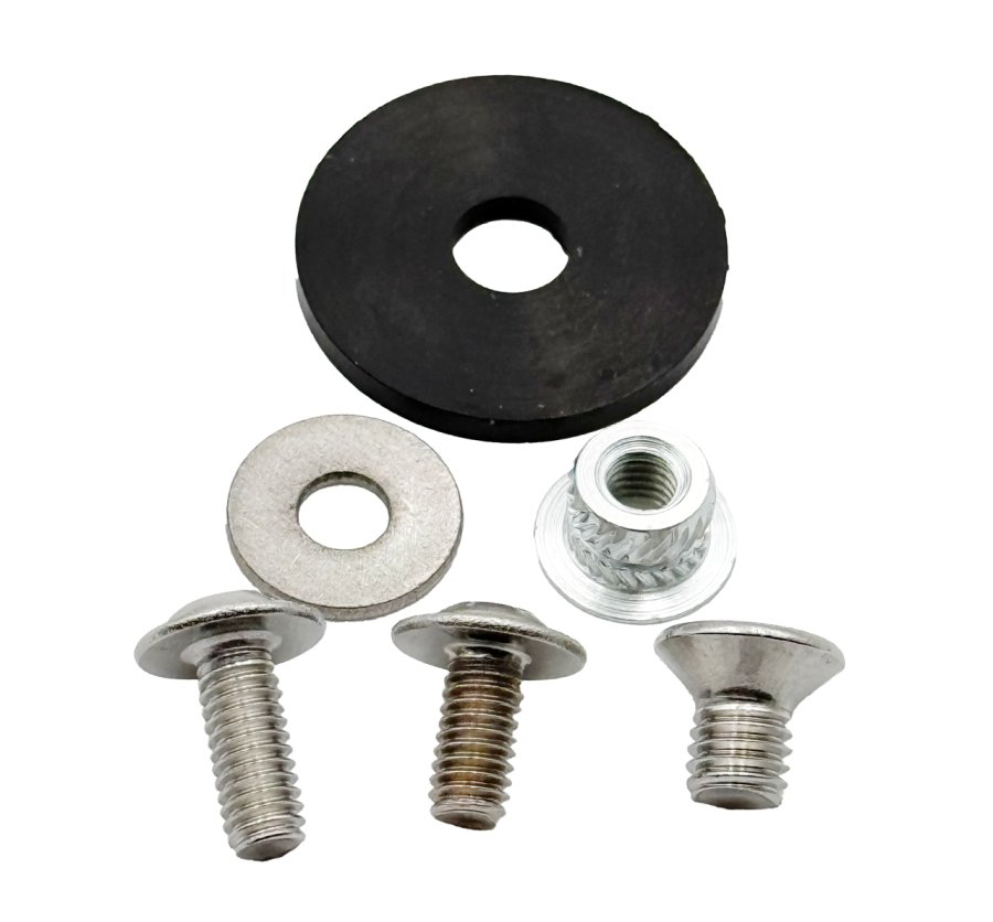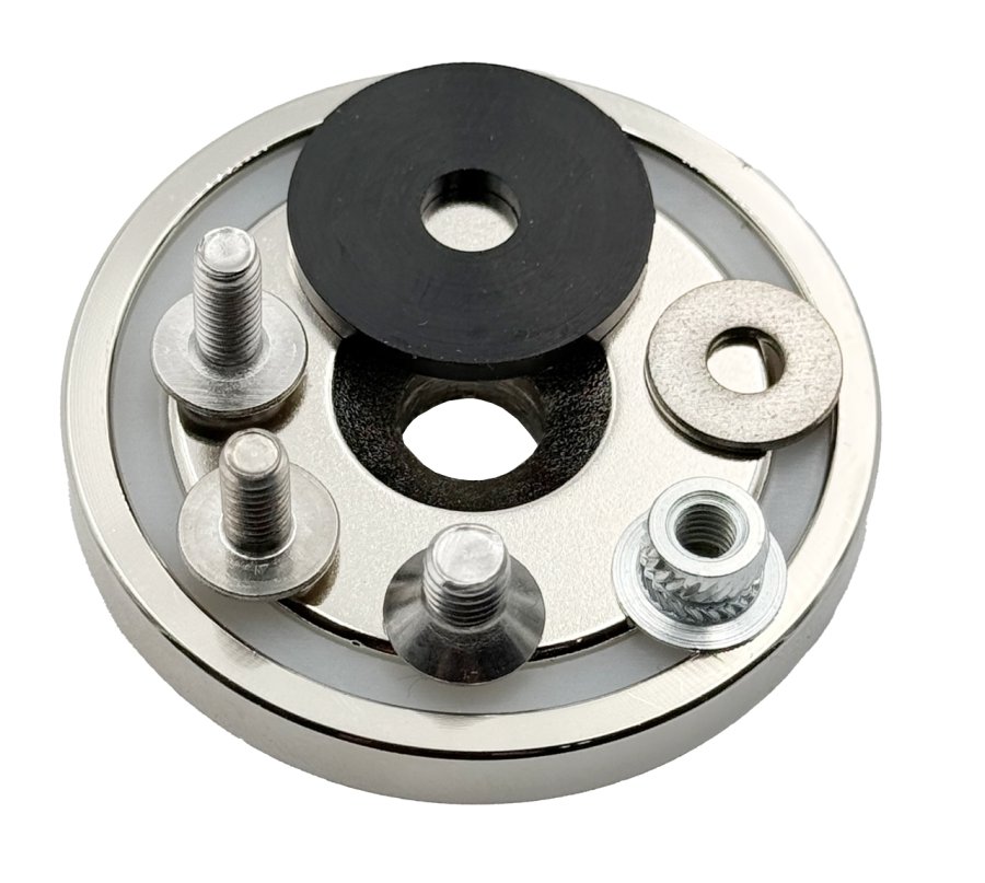 - Remove the screw, insert the rubber washer between the pouch and the magnet, then retighten. The washer prevents rotation and reduces the chance of the insert pulling out from overtightening.