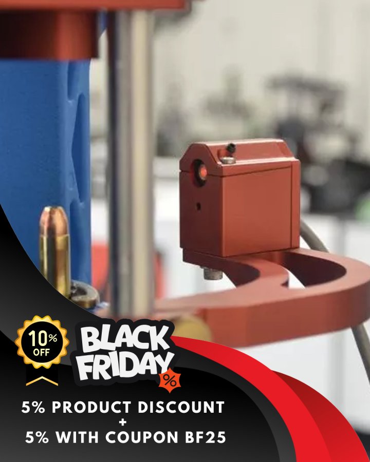 We've created a laser mounted system on a user-adjustable slider that allows you to point the laser right where you want it - at the tip of the bullet or directly on the brass. If the laser beam is interrupted every time your machine makes a stroke, the machine continues ( i.e. if a bullet head or brass is present). If the laser is bounced back from the mirror and the circuit completes, the machine stops at the top of the stroke. You determine the height of the laser, you are now more in control of the operation of your machine. The user-adjustable slider is operated through a traditional thumb screw.