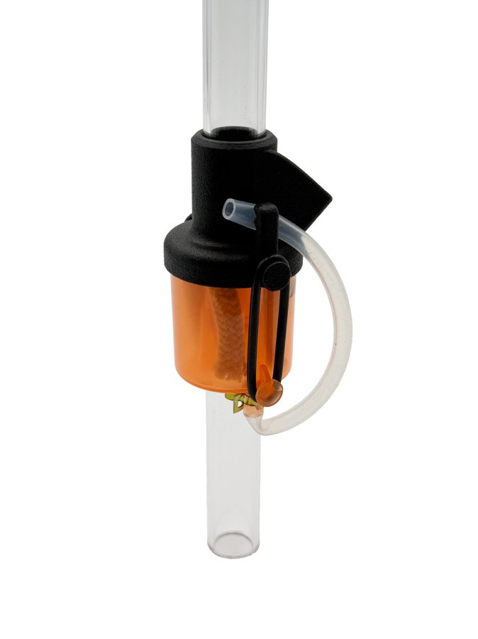Mounted directly onto the case feeder tube, the unit applies a controlled amount of lubricant to each case as it passes down toward the shell plate. Lubrication levels can be fine-tuned by adjusting both the reservoir fill level and the protrusion length of the wicks. The system uses four wicks to draw lubricant from the reservoir and ensure even, consistent application.