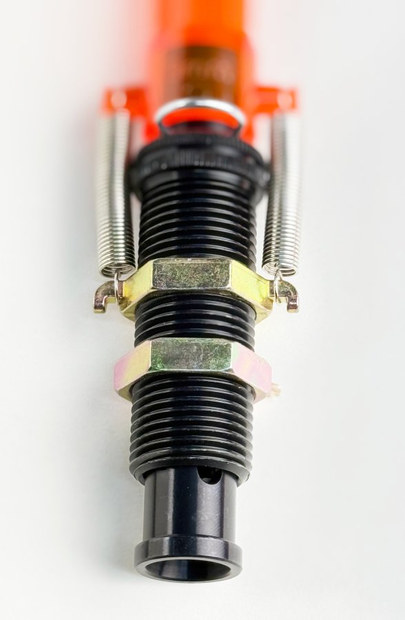 Rifle: No se incluye un embudo de polvo en expansión con los calibres de rifle, ya que no es posible acretar el latón del rifle en el embudo de polvo. Eso llevaría a un agujero de paso de polvo demasiado pequeño. Agrandar el latón debe hacerse como etapa de preparación o usando un dado M modificado en el 1050.
